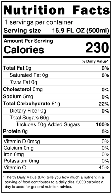 Ingredients: Alkaline Filtered Water, Organic Florida Cane Sugar, Organic Lemons, and Mango Fruit.